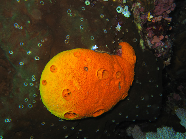 ドロップオフのウォールに生えている大きなスポンジ(エレファントイアースポンジ)、元気なサンゴとパープルビューティーやハナダイの群れ、真っ白な砂地(画像参照)はかなり癒し度高い。一番右の画像はサンゴの間にいた黄色いカサゴです。