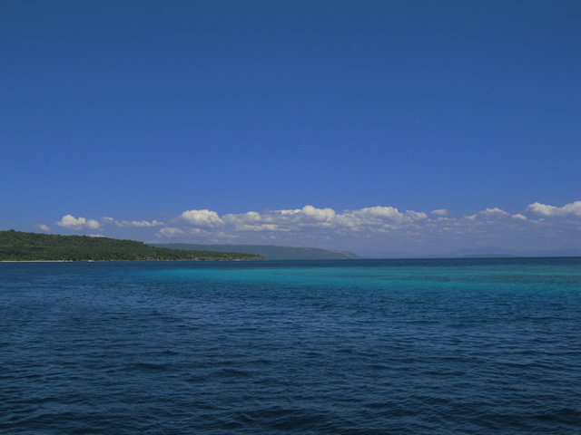 MOYO島から東へ移動、SATONDAで潜る。なだらかな斜面と砂地に離れ根のあるポイント。水温28度、透明度15メートル前後。