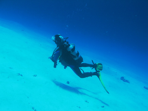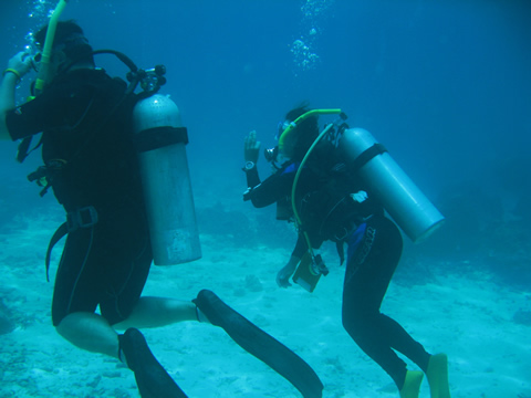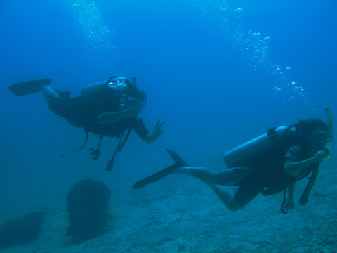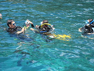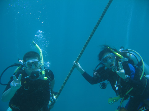 さて料理の支度をしていただいている間、こちら潜水チームは海へ。透明度かなりいいです。波も無く快適な講習、水中は助手の哲さんが撮影してくださいました。