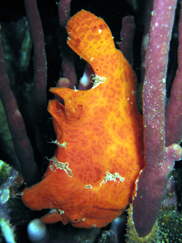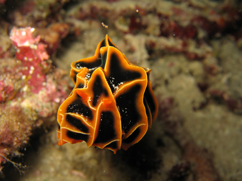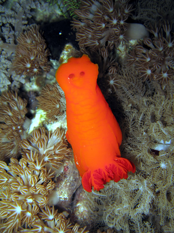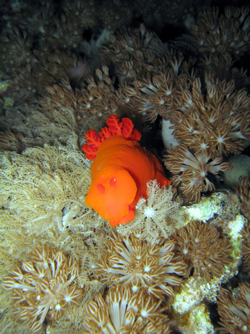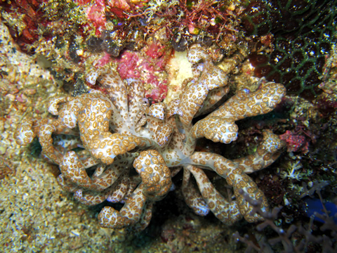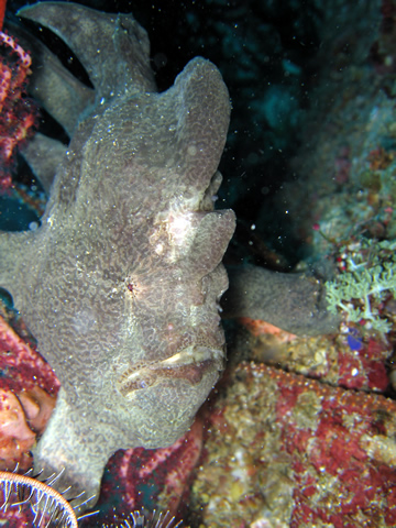 オオモンカエルアンコウの近くにいたのは、去年カンニバルロックで見つけてガイドがうれしさのあまり悲鳴をあげたオオコノハウミウシでした。二年続けて見れるなんて超ラッキーだとガイドに言われ有頂天!それにしてもこのオオコノハウミウシって巨大だし(全長20cmぐらい)とてもウミウシには見えないのでありました。