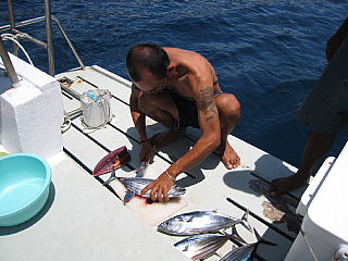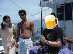 今回ボートでいろいろ世話をしてくれたタイ人クルー。でも魚のあたりをチェックしたのは家のねぇちゃんが先だったよぉ。