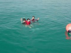 エンジンの調子が悪く、出航15分後にストップ。エンジン救助隊を待つ間も無駄にしません。みなさん早速水泳大会。講習oboeist_miyopieさんとmioponさんもこの時間を利用して水泳と浮き身のテスト無事終了。