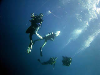 このカタマランタイプのキングクルーザー(全長約85m、10年前日本から輸入された客船)は深度32mに底着。25mエンジンルーム、18m客室エリア、12mキャプテン室と安全にマルチレベルダイブを楽しむことができるのも大きな特徴。7m煙突部付近で安全停止、浮上。