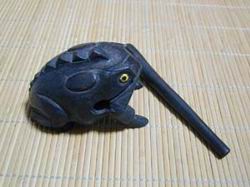 背中のでこぼこ部分に棒をあてて上下に動かしてみてください。あら、不思議 ”ケロッケロッ””キョロッキョロ”というカエルの声が…。癒し系です。(By Pako)